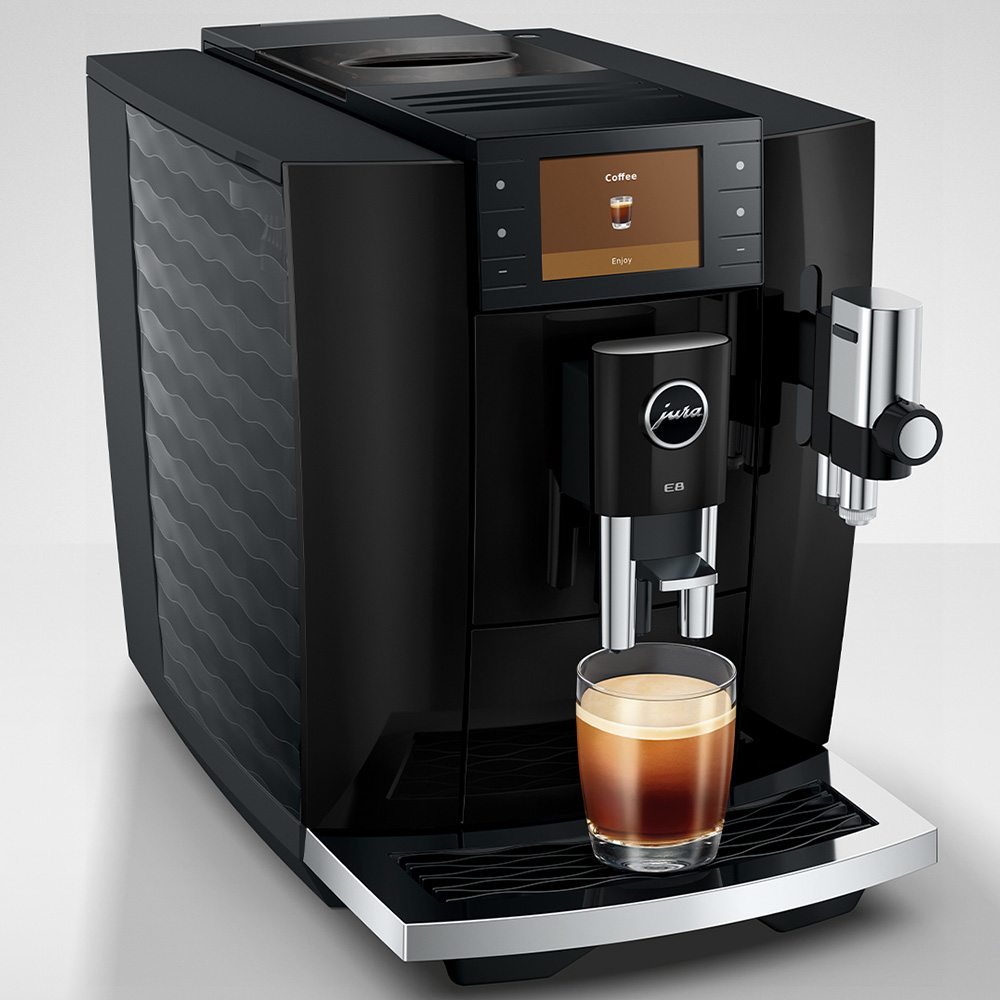 Nowy model – następca JURA E8 Piano Black (ED) Ekspres automatyczny JURA E8 Piano Black (ED) rekomendowany jest przede wszystkim do domów oraz małych biur, gdzie zapotrzebowanie na kawę wynosi ok 30 filiżanek dziennie. Ekspres wyposażony jest w stalowy młynek P.A.G.2 (Professional Aroma Grinder) z możliwością swobodnej regulacji stopnia mielenia w dowolnym momencie. Rozwiązanie to przekłada się na jeszcze lepszy smak takich specjałów jak espresso, cappuccino, café crema czy latte macchiato. Największą zmianą w porównaniu do poprzedniego modelu jest rozszerzenie menu kawowych specjałów aż do 27 napojów oraz wprowadzenie trzech nowych profili parzenia: Light Brew – kawa parzona w temperaturze ok. 60 °C, łagodniejsza i gotowa do picia od razu po przygotowaniu. Hot Brew – klasyczna gorąca kawa. Sweet Foam – napoje mleczne z aromatyzowaną pianką mleczną z dodatkiem ulubionego syropu. Dodatkowo JURA E8 (ED) otrzymała nowe funkcje: Quality Assistant – inteligentny system kontroli czyszczenia i konserwacji zastępujący standardowe komunikaty serwisowe. Coffee Timer – możliwość zaprogramowania przygotowania kawy na określoną godzinę w aplikacji J.O.E. (wymaga opcjonalnego modułu Wi-Fi).
