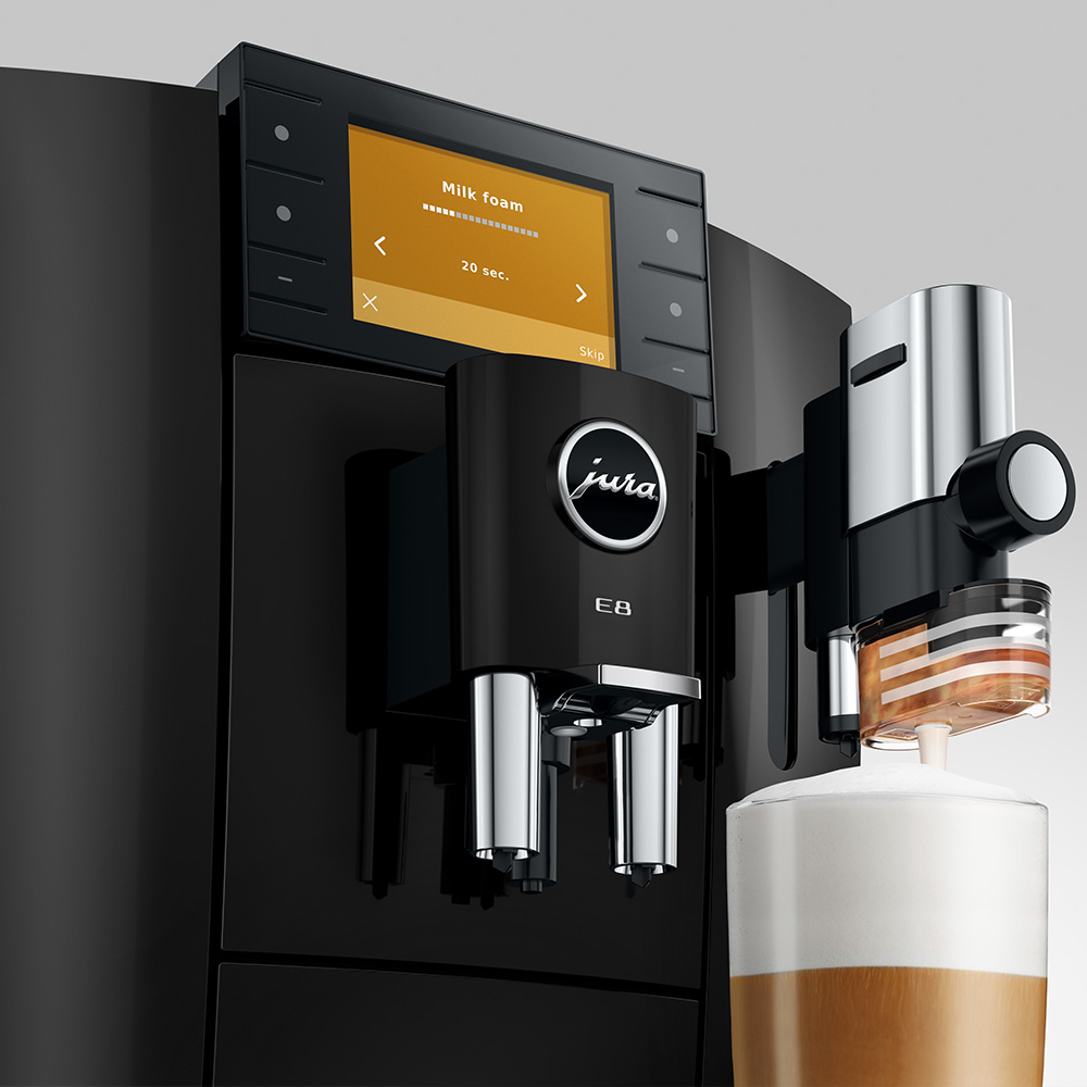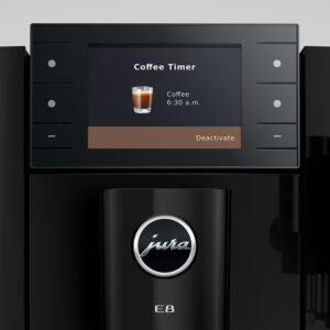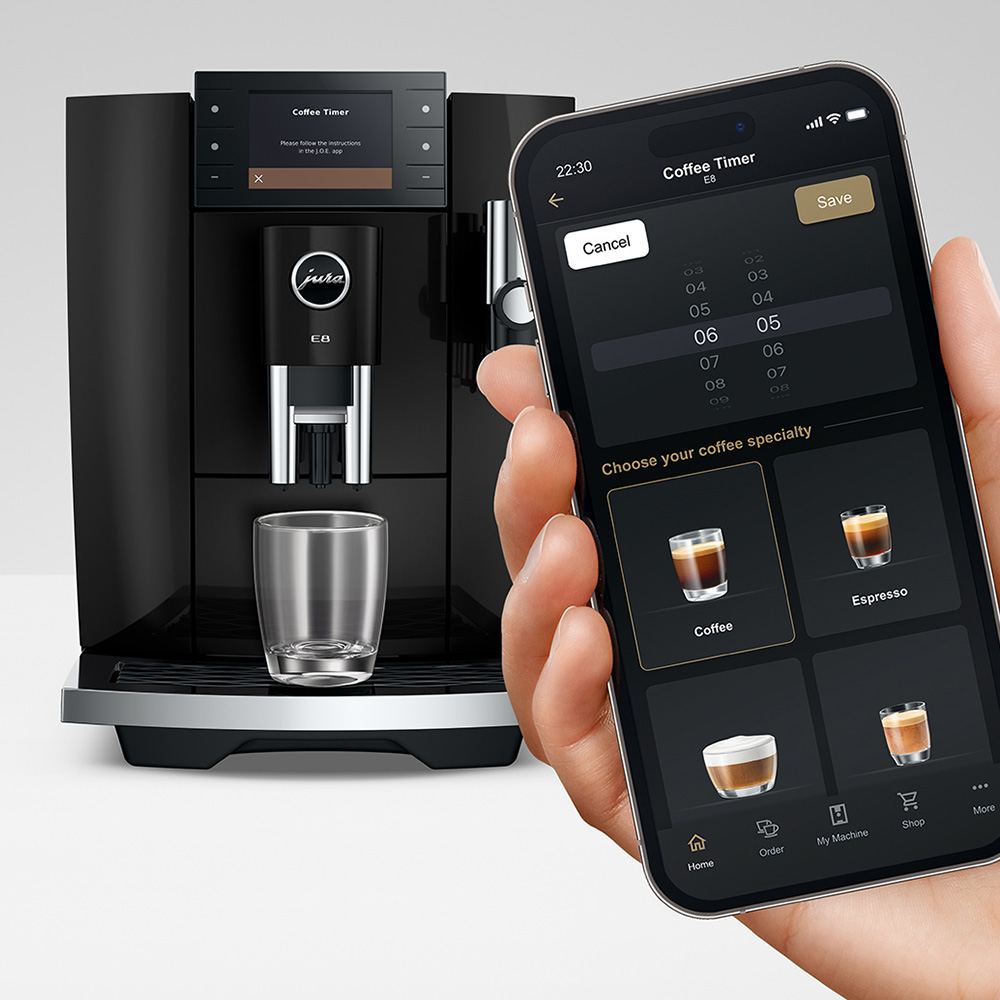 Model Jura E8 (ED) wyposażony jest w funkcję Coffee Timer, czyli możliwość zaprogramowania przygotowania kawy na określoną godzinę w aplikacji mobilnej Jura J.O.E.