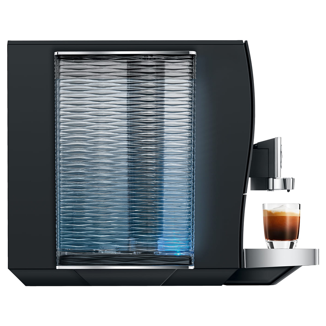 Subtelnie falisty kształt zbiornika na wodę nadaje ekspresowi wyjątkowy charakter, a wypukło-wklęsły front harmonijnie podkreśla jego elegancką sylwetkę. Delikatnie zaokrąglony panel sterowania zaprasza do interakcji, a tacka na filiżanki tworzy efektowną, przestronną kompozycję.
