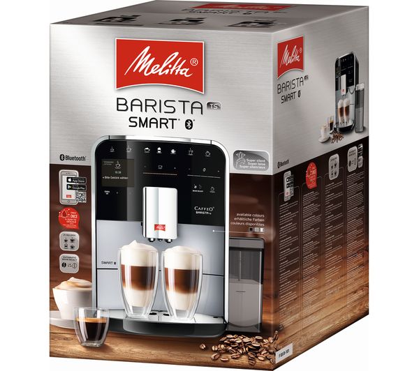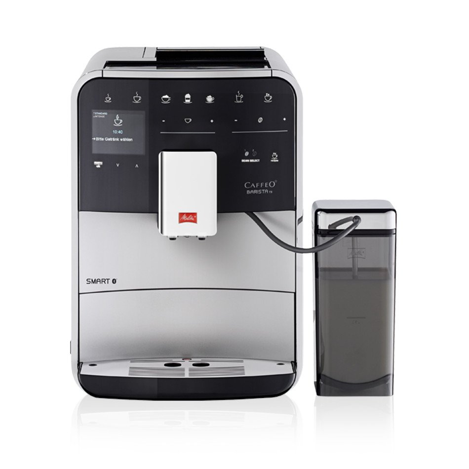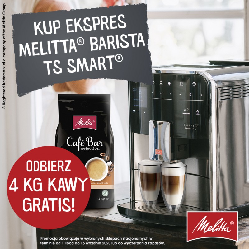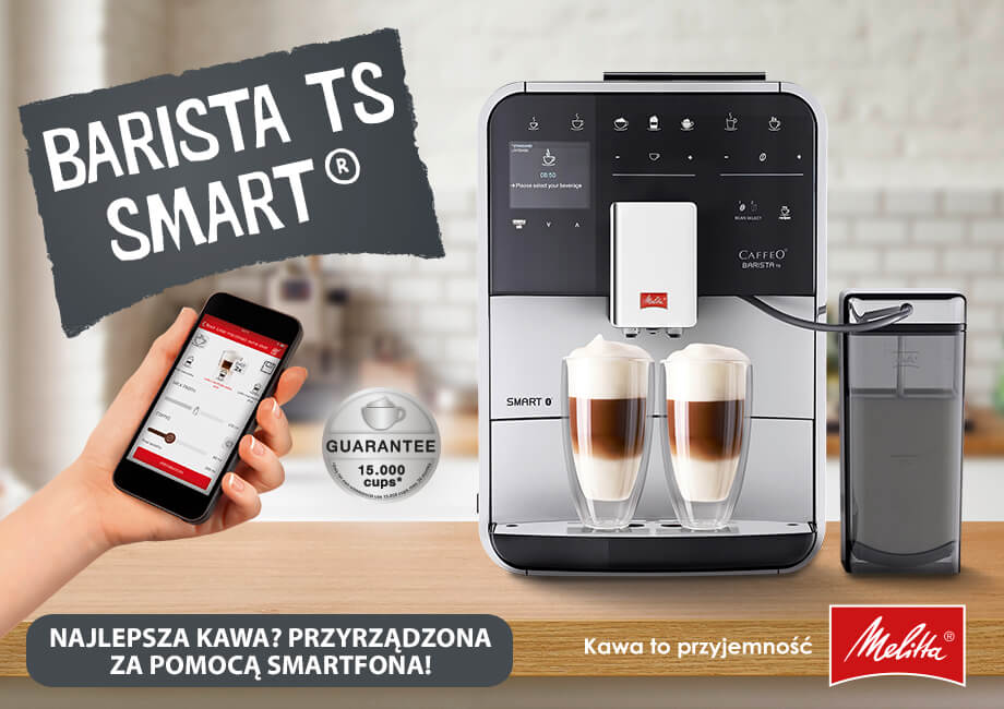 Melitta BARISTA TS SMART to profesjonalny ekspres automatyczny przeznaczony do użytku domowego i niewielkich biur. TS SMART zapewnia wysoką jakość napojów jednocześnie będąc bardzo łatwy w obsłudze. Intuicyjne menu sprawia, że zrobienie każdej kawy zajmuje tylko kilka sekund. Ekspres Barista TS SMART pozwala przygotować pyszne kawy czarne i równie wyśmienite kawy mleczne. Ekspres Melitta Barista TS Smart cechuje niezwykle smukły design zaprojektowany przez niemiecką firmę. Ekspres jest bardzo zgrabny, idealnie wpasuje się w każdą kuchnię. Ekspres został wyposażony w najnowocześniejsze technologie, które gwarantują najwyższą jakość kawy oraz satysfakcję z użytkowania urządzenia. TS Smart umożliwia przygotowanie aż 21 różnych napojów. Za pomocą jednego kliknięcia możemy zaparzyć kawę mleczną, a wylewka All-in-one sprawia, że nie trzeba przesuwać przy tym filiżanki. Ekspres T Smart pozwala robić 2 kawy mleczne na raz. Jest to optymalny wybór dla osób ceniących nowoczesne technologie, ponieważ ekspres wyposażony jest w system bluetooth, co pozwala na sterowanie nim z aplikacji za pomocą telefonu lub tabletu. Możemy w łatwy sposób przygotować wszystkie wybory kawowe nawet nie podchodząc do ekspresu. Dzięki intuicyjności tej aplikacji znacznie łatwiej obsługujemy procesy czyszczenia ekspresu – są w niej dostępne także filmy instruktażowe. Ekspres został wyposażony w dwa osobne pojemniki na kawę ziarnistą z funkcją Automatic Bean Select, co umożliwia używanie dwóch innych rodzajów kaw jednocześnie – wedle uznania (np. espresso do kaw czarnych oraz cafe creme do kaw mlecznych). Dopiero przed wyborem specjału decydujesz, na którą kawę masz ochotę. W ekspresie na bieżąco należy wymieniać filtry oraz czyścić urządzenie przeznaczonymi do tego środkami. Wbrew pozorom nie jest to absolutnie nic trudnego. W ekspresie T Smart istnieje możliwość zamontowania filtra Pro Aqua, dzięki któremu odkamienianie może odbyć się jedynie raz w roku. Ekspres posiada funkcję easy cleaning, która pozwala na szybkie przepłukanie toru spieniania mleka za pomocą wody znajdującej się w ekspresie bez użycia jakichkolwiek dodatkowych akcesoriów. Cały zestaw akcesoriów do ekspresów Melitta dostępny jest w naszym sklepie. Ekspres posiada także funkcję Moja kawa, która umożliwia spersonalizowanie danego produktu nawet pod 4 inne osoby. Niezawodność i intuicyjność ekspresu sprawiają, że jest on bardzo często wybierany przez naszych klientów. Jest to zdecydowanie jeden z najlepszych wyborów jeśli chodzi o ekspresy domowe. W zestawie z ekspresem dołączany jest 1-litrowy, jakościowy pojemnik na mleko Melitta. Ekspres jest jednym z wytrzymalszych na rynku. Jego dzienną wydajność ocenia się nawet na 30 kaw. Wszystkie ekspresy Melitta objęte są 24 miesięszną gwarancją door-to-door, również przy zakupie dla firm na fakturę VAT.