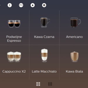 Kupując u nas ekspres otrzymujecie Państwo urządzenie gotowe do pracy – ekspres jest fabrycznie skonfigurowany na 10 podstawowych napojów: Espresso – 35 ml, Podwójne espresso – 50 ml, Kawa czarna – 110 ml, Americano 110 ml, Mleko 70 ml, Cappucino – 110 ml, 2 x Cappucino – 110 ml, Latte macchiato- 110 ml, Kawa Biała – 110 ml, Caffe Latte – 110 ml. Po uruchomieniu ekspresu wgrane napoje pojawiają się na ekranie i możemy od razu cieszyć się pyszną kawą czarną i mleczną.