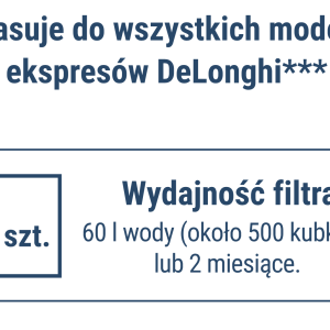 - Wydajność jednego filtra – 60 litrów wody (około 500 kubków kawy) lub 2 miesiące od pierwszego kontaktu filtra z wodą
