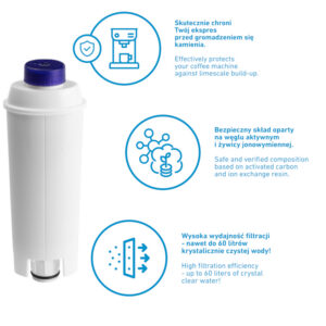 Wysokiej jakości zamiennik filtrów do ekspresów DeLonghi – DLS C002 i SER 3017. Skutecznie oczyszcza wodę z drobin mechanicznych, metali ciężkich, pestycydów i wapnia. Dzięki specjalnej formule wkładu zapewnia 20% lepszą filtrację wody, przeciwdziałając osadzaniu się kamienia w ekspresie. Poprawia smak i zapach wody, co znacząco wpływa na aromat kawy.