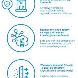 Wysokiej jakości zamiennik filtra – jak Aqua Clean. Oczyszcza wodę z drobin mechanicznych, metali ciężkich, pestycydów, wapnia. Dzięki specjalnej formule wkładu 20% lepsza** filtracja wody przeciwdziałająca osadzaniu się kamienia w ekspresie. Odczuwalnie poprawia smak i zapach wody, co ma bardzo duże znaczenie przy zaparzaniu kawy. Zastosowanie filtra ułatwia otrzymanie idealnej w smaku, oczyszczonej wody, która jest pozbawiona osadów wapiennych, aby chronić urządzenie przed zakamienieniem.