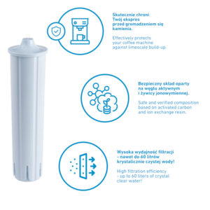 - Wydajność jednego filtra – 60 litrów wody (około 500 kubków kawy) lub 2 miesiące od pierwszego kontaktu filtra z wodą