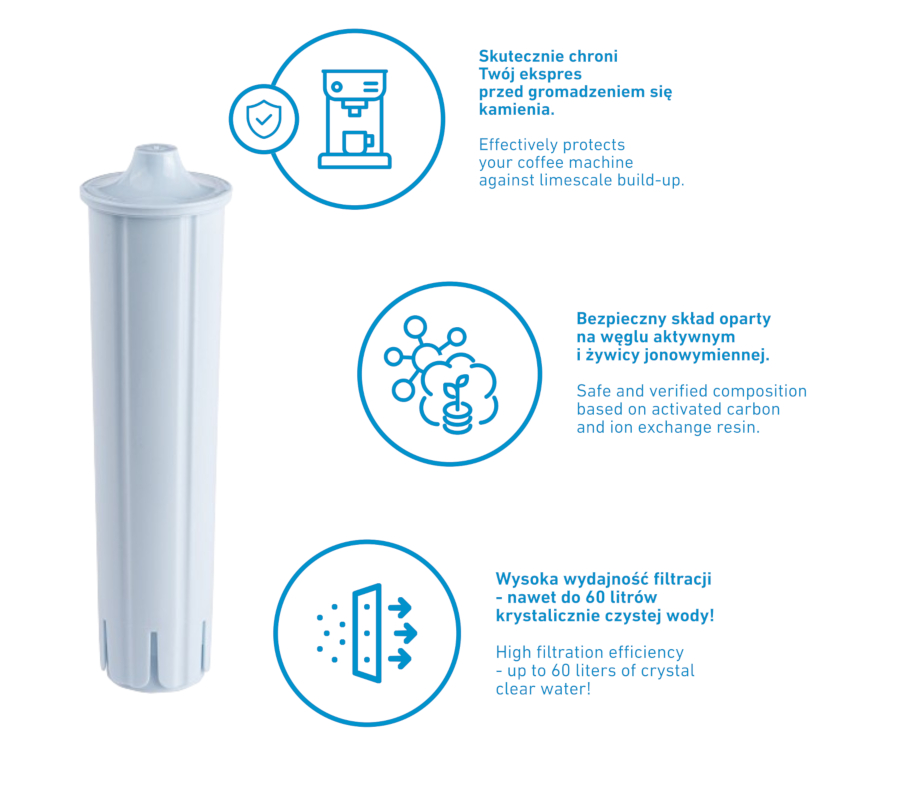 - Pewność – zawsze masz pod ręką filtr gotowy do wymiany, co chroni Twój ekspres przed kamieniem i przedłuża jego żywotność.