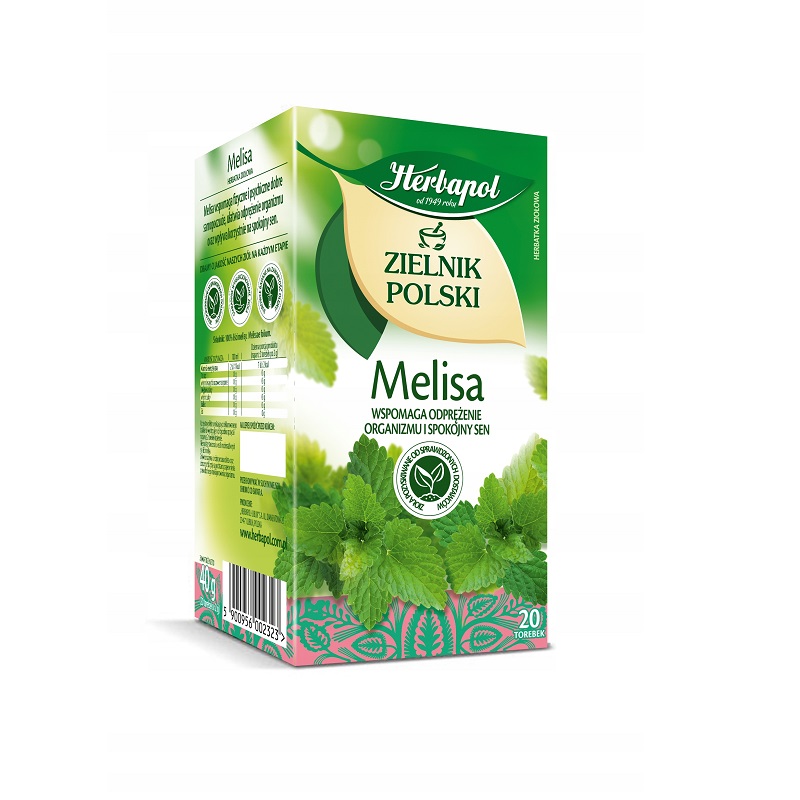 Herbapol Polski Zielnik to szeroki wybór naturalnych herbat ziołowych. W 100% naturalne suszone kwiaty polskich ziół zamknięte w przezroczyste saszetki. Gwarancja pozytywnego wpływu na organizm. Melisa wspomaga fizyczne i psychiczne dobre samopoczucie, ułatwia odprężenie organizmu oraz wpływa korzystnie na spokojny sen. Skład: Liść melisy 100%