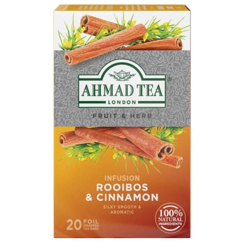 Rooibos & Cinnamon – Rooibos i Cynamon Fruit & Herbal Infusions – herbatki-napary z owoców i ziół Opakowanie: kartonik, 20 torebek w kopertach aluminiowych. Rozgrzewający napar z delikatną nutą czerwonej herbaty, Rooibos. Znakomity na zimowe wieczory. Herbatka szczególnie polecana miłośnikom cynamonu. Herbata wolna od teiny – doskonała dla kobiet w ciąży, osób starszych czy chorujących na nadciśnienie. Wyrazisty naturalny smak zatrzymaliśmy w hermetycznych aluminiowych kopertach. Specjalnie zaprojektowane opakowanie ułatwia wyjmowanie i przechowywanie produktu.