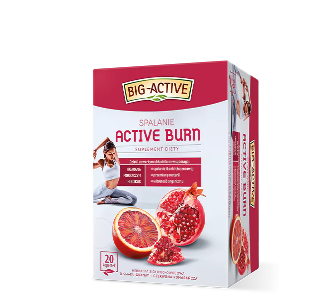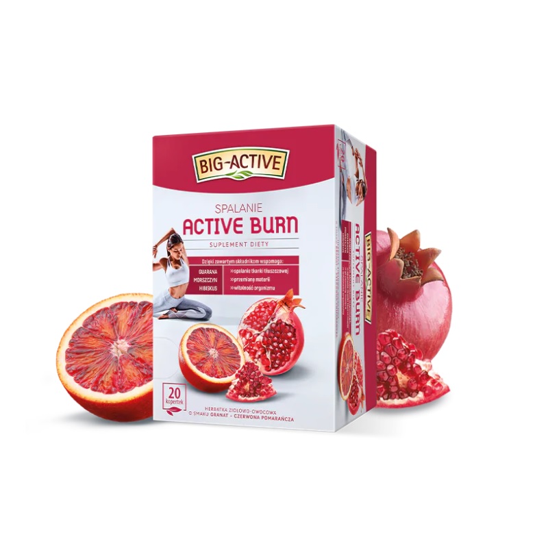 Seria herbat funkcjonalnych od Big-Active wspomagające odchudzanie, oczyszczanie organizmu, kontrolowanie oraz stabilizacja wagi. W składzie tylko 100% naturalne składniki bez sztucznych dodatków. Herbatka ziołowo-owocowa o smaku granat + czerwona pomarańcza. Active Burn Spalanie suplement diety to kompozycja wielu składników m.in. nasion guarany, morszczynu i kwiatu hibiskusa. Dzięki zawartym składnikom wspomaga:
