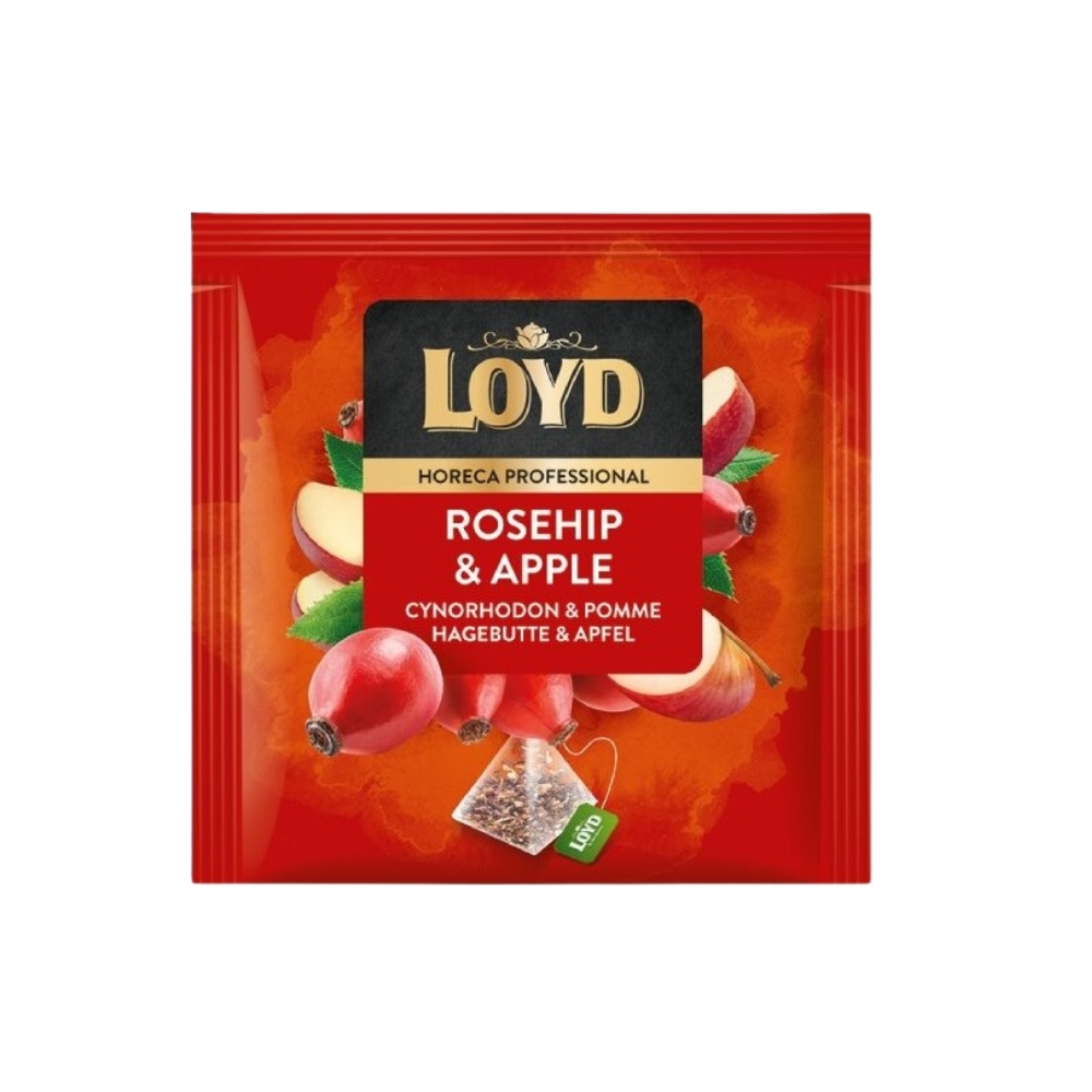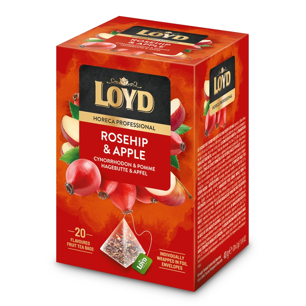 Herbata LOYD Dzika Róża i Jabłko to aromatyczna owocowa herbata, której słodyczy nadaje smak soczystego jabłka. Dzika róża wspanaile uzupełnia smak jabłka. Idealne połączenie do popijania w chwilach relaksu. Opakowanie zawiera 20 wygodnych w użyciu piramidek z herbatą. Linia LOYD HORECA PROFESSIONAL to oferta herbat wysokiej jakości dedykowanych gastronomii oraz hotelarstwu. Specjalnie wyselekcjonowane herbaty oraz smaki gwarantują zadowolenie najbardziej wymagającego Klienta. Każda torebka herbaty zapakowana jest w kopertę z metalizowanej folii o wysokiej barierowości, co bezpośrednio przekłada się na utrzymanie świeżości produktu.