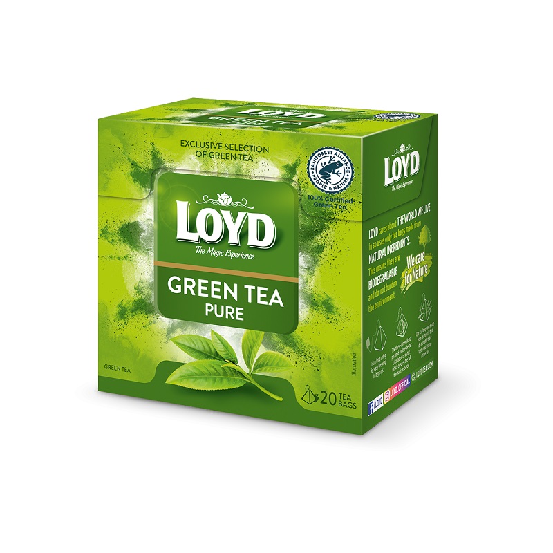 Dzięki zastosowaniu innowacyjnego, jedwabistego materiału, neutralne smakowo piramidki jeszcze lepiej uwalniają zawarty w suszu bukiet i smak. Trójwymiarowy kształt torebki zapewnia listkom herbaty wystarczająco dużo miejsca, aby w pełni mogły się rozwinąć i oddać pełnię aromatu, tworząc napar najwyższej jakości – jak z zaparzacza. Kolekcja zielonych herbat LOYD pomoże Ci odkryć magię we wszystkim, co Cię otacza. Składniki: Herbata zielona.