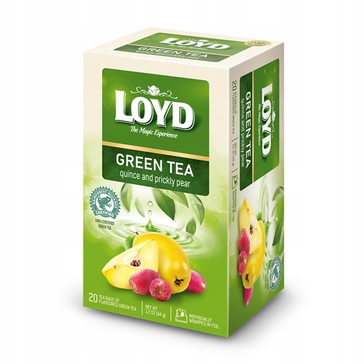 LOYD Green Quince & Prickly Pear to linia zielonych herbat w oryginalnych, egotycznych połączeniach smakowych o niepowtarzalnym, zmysłowym aromacie. Ta niezwykle sensualna linia została zaprojektowana specjalnie po to, by pobudzać nie tylko zmysł smaku, ale także otulić Cię głębią kompozycji woni. Skosztuj zielonej herbaty o kwiatowym smaku opuncji doprawionej orzeźwiającą, aromatyczną pigwą. To znakomite połączenie egzotycznej rośliny z „polską cytryną” pozwoli Ci odkryć skarby dwóch światów w jednej filiżance! Daj się oczarować, bo LOYD to herbata z nutą magii. Składniki: herbata zielona 95,5%, aromat opuncji, owoc pigwy 1,5%, owoc opuncji 0,5%.