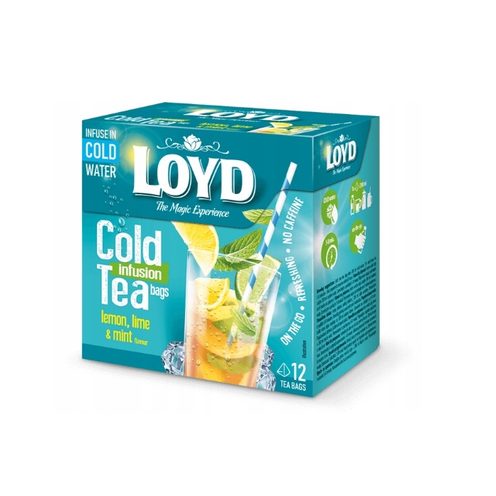 Cold Infusion Tea Bags to nowość w asortymencie Loyd. Herbatka owocowo-ziołowa o smaku cytryny, limonki i mięty, którą przygotowuje się w zimnej wodzie, to idealne rozwiązanie na upalne lato. Przygotowana ze skrupulatnie dobranych składników orzeźwia nawet w najcieplejsze dni. Połączenie kwaskowatości cytryny i limonki z liśćmi mięty urzeka smakiem, dając jednocześnie wrażenie chłodu. Orzeźwiające aromaty cytryny, limonki wraz liśćmi mięty zostały zamknięte w trójwymiarowych piramidkach, które dzięki zastosowaniu innowacyjnego, jedwabistego materiału, jeszcze lepiej uwalniają zawarty w owocowym suszu bukiet i smak. Idealnie neutralne smakowo, w pełni biodegradowalne torebki znakomicie eksponują surowiec, dzięki czemu napój w Twojej szklance nie tylko zadziwi niepowtarzalnym bukietem, ale także pomoże zaczarować każdą chwilę, tak by pomóc Ci odkryć magię we wszystkim, co Cię otacza. Ice Tea o smaku cytryny, limonki i mięty, to doskonały pomysł dla osób potrzebujących ochłody w ciepłe dni i alternatywy dla słodkich napojów. To świetne rozwiązanie dla ceniących sobie leniwy wypoczynek, jak i dla osób uprawiających sporty i wypoczywających aktywnie. Dzięki temu, iż torebka zalewana jest zimną wodą, herbatkę można zabrać ze sobą i przygotować w dowolnym miejscu. Sposób przygotowania: Dodać torebkę do 200 ml zimnej wody. Zamieszać i odczekać 5-8 minut. Napój należy spożyć do 8 godzin od przygotowania. Składniki: biały kwiat hibiskusa, owoc jabłka, liść mięty spearmint (Mentha spicata) 10%, trawa cytrynowa, skórka cytryny 5%, prażony korzeń cykorii, regulator kwasowości – kwas cytrynowy, liść stewii, aromat naturalny cytryny 2%, aromat naturalny limonki 1%.
