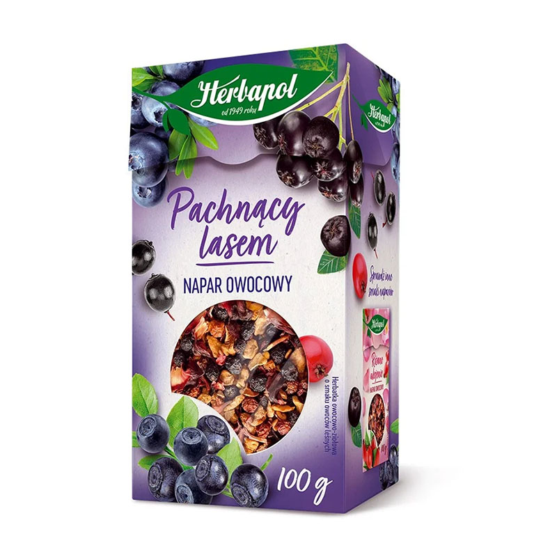 Napar owocowy Pachnący Lasem Herbapol to aromatyczna mieszanka owoców leśnych, m.in. aronii, jagód, borówek i głogu, która przeniesie Cię smakiem i zapachem wprost do serca lasu.