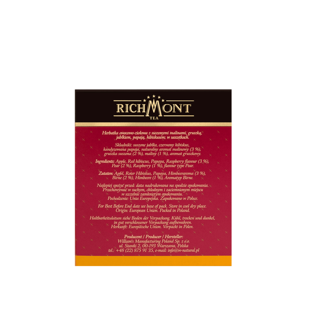 Soczysta słodycz gruszki. Uwodzący smak leśnych malin. Urzeka kwaskową słodycz. Herbatka owocowo-ziołowa z suszonymi malinami, gruszką, jabłkiem, papają, hibiskusem; w saszetkach. Składniki: suszone jabłko, czerwony hibiskus, kandyzowana papaja, naturalny aromat malinowy (3 %), gruszka suszona (2 %), maliny (1 %), aromat gruszkowy. Zawartość opakowania: 240 g (40 saszetek po 6 g) Pochodzenie: Unia Europejska. Zapakowano w Polsce. Sposób zaparzania: Na dzbanek o pojemności 450 ml użyć 1 saszetkę Richmont. Zaparzać przez 8-10 minut w 100 °C. Polecamy stosowanie wody filtrowanej lub źródlanej (o niskiej twardości).