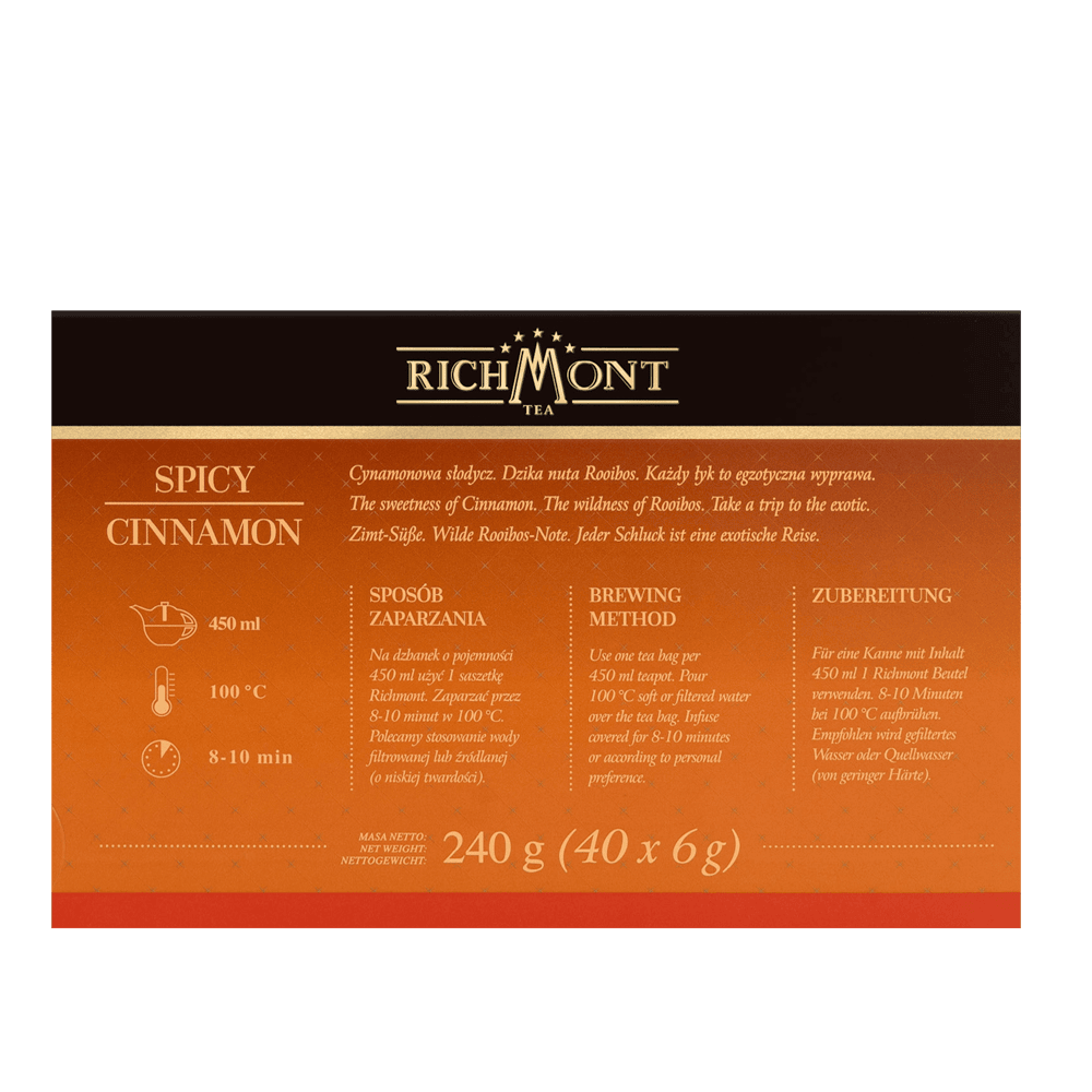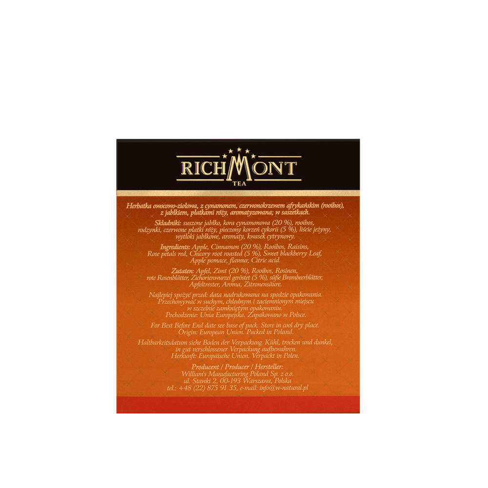 Herbatka owocowo-ziołowa, z cynamonem, czerwonokrzewem afrykańskim (rooibos), z jabłkiem, płatkami róży, aromatyzowana; w saszetkach. Składniki: suszone jabłko, kora cynamonowa (20 %), rooibos, rodzynki, czerwone płatki róży, pieczony korzeń cykorii (5 %), liście jeżyny, wytłoki jabłkowe, aromaty, kwasek cytrynowy. Zawartość opakowania: 240 g (40 saszetek po 6 g) Pochodzenie: Unia Europejska. Zapakowano w Polsce. Sposób zaparzania: Na dzbanek o pojemności 450 ml użyć 1 saszetkę Richmont. Zaparzać przez 8-10 minut w 100 °C. Polecamy stosowanie wody filtrowanej lub źródlanej (o niskiej twardości).