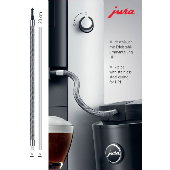 Przewód mleka owinięty wysokiej jakości spiralną sprężyną ze stali nierdzewnej łączy pojemnik na mleko z wylewką mleka i uzupełnia eleganckie, harmonijne wzornictwo każdego automatycznego ekspresu do kawy. Zwarta osłona ze szlachetnego materiału gwarantuje najwyższą ochronę przed promieniowaniem UV i oddziaływaniem światła. Dopasowane połączenia wtykowe zapewniają hermetyczne przejście. Ten natychmiast gotowy do użycia przewód mleka stanowi idealne rozwiązanie zapewniające zawsze optymalny poziom higieny mleka. Aby zachować te właściwości, kluczowe znaczenie ma regularna konserwacja. Pełną higienę w każdym automatycznym ekspresie do kawy JURA zapewniają zintegrowane programy płukania i czyszczenia. Zalecamy czyszczenie systemu mlecznego raz dziennie. Przy normalnym użytkowaniu przewód mleka należy wymienić po pierwszych 3 miesiącach. Zestaw podłączeniowy do systemów mlecznych można nabyć online lub w sklepach specjalistycznych. Kompatybilny z modelami: