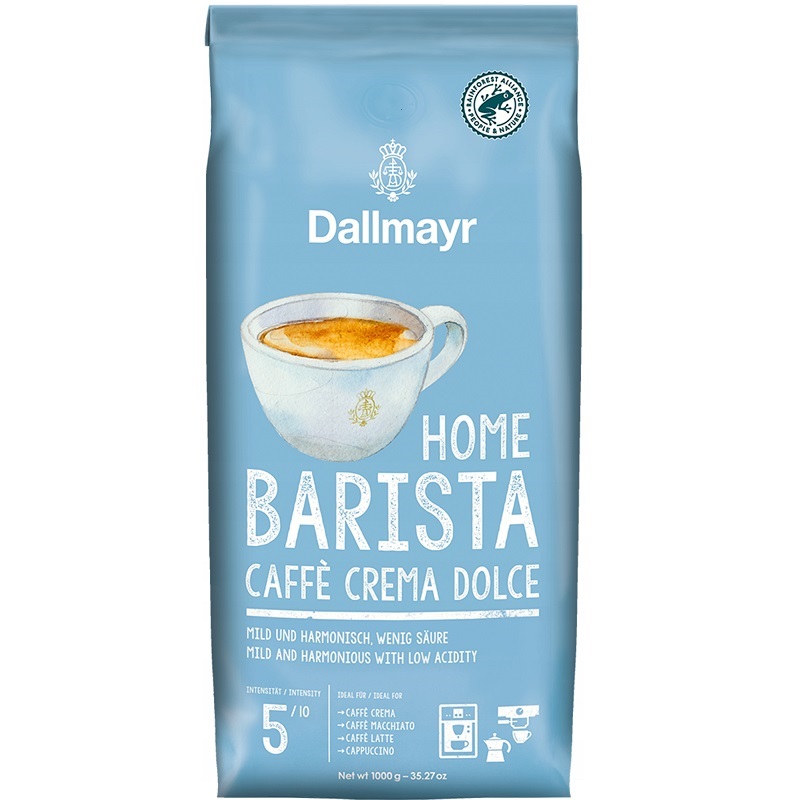 Gęsta, aksamitna i złotobrązowa crema sprawia, że ta kawa stanie się przyjemnością w domu. Ziarna kawy pochodzą ze zrównoważonej uprawy. Nie są one zbyt ciemne, ale są długo palone, aby uzyskać łagodny, harmonijny smak z niewielką kwasowością. W kawie wyczuwalny jest też delikatny, orzechowy aromat. Cechy: