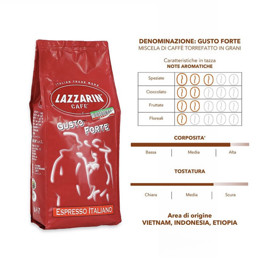 Lazzarin Gusto Forte to wyrazista mieszanka stworzona z myślą o miłośnikach intensywnych doznań kawowych. Połączenie 60% wysokogatunkowej Arabiki z 40% Robusty zachwyca od pierwszego łyku. Arabika wnosi delikatny aromat, subtelną kwasowość oraz lekkie nuty owocowe, natomiast Robusta dodaje pełni smaku, wyczuwalnych akcentów czekolady oraz kremowej konsystencji.