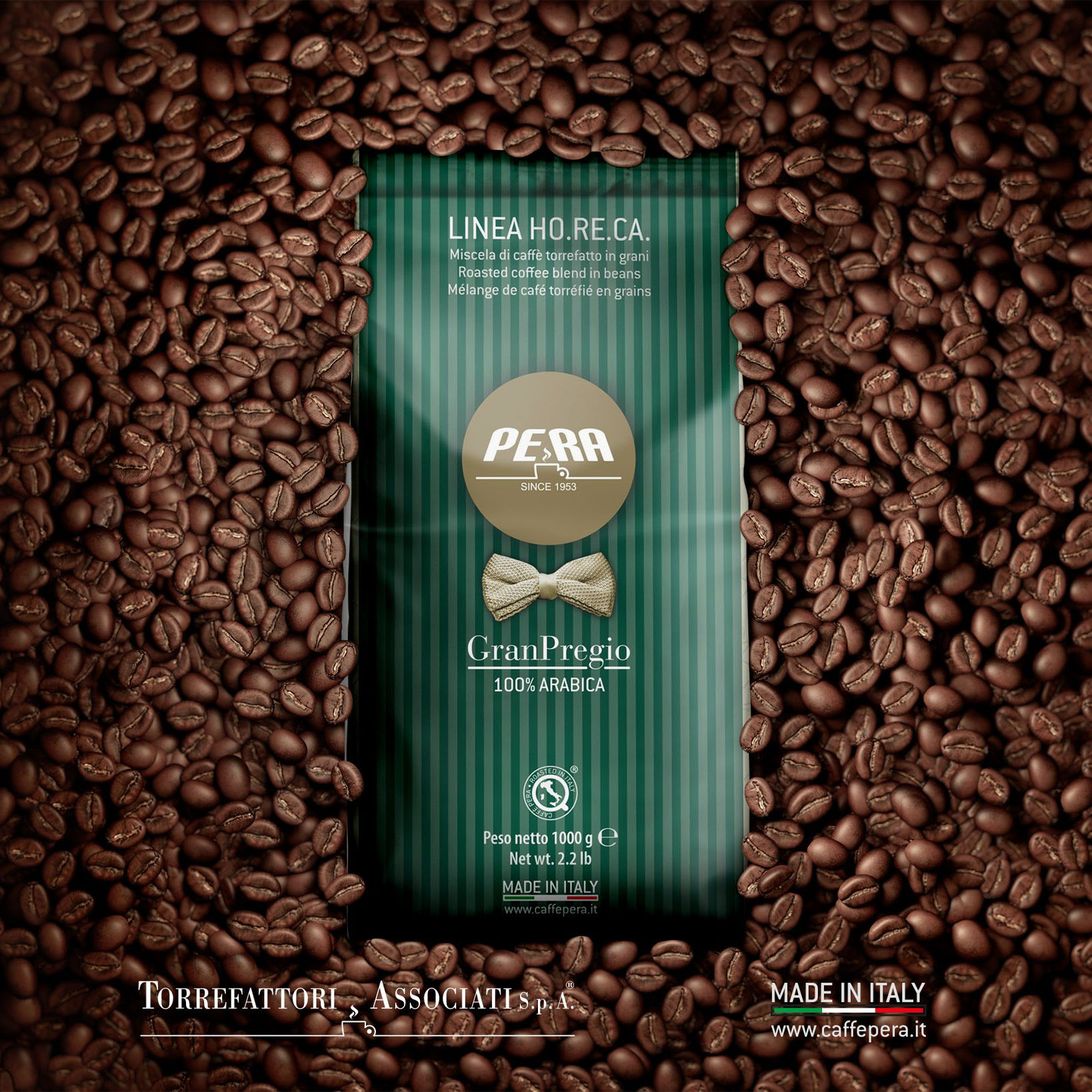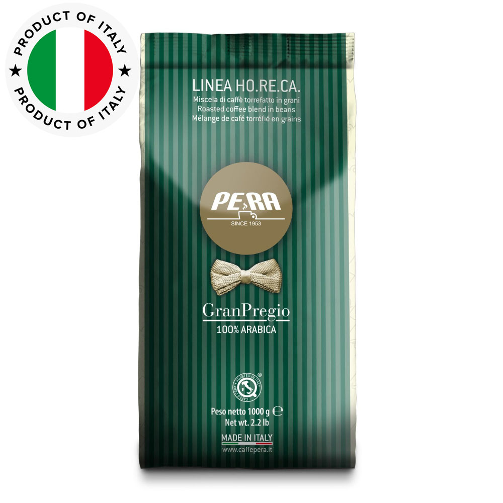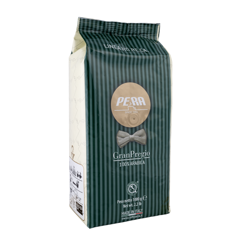 Pera Gran Pregio to 100% Arabiki, wyróżniającej się intensywnym aromatem, subtelną słodyczą i harmonijnym finiszem. Kawa charakteryzuje się wyjątkową delikatność z wyraźnie wyczuwalnymi nutami owocowymi, które doskonale komponują się z wyrazistym, klasycznym charakterem espresso.