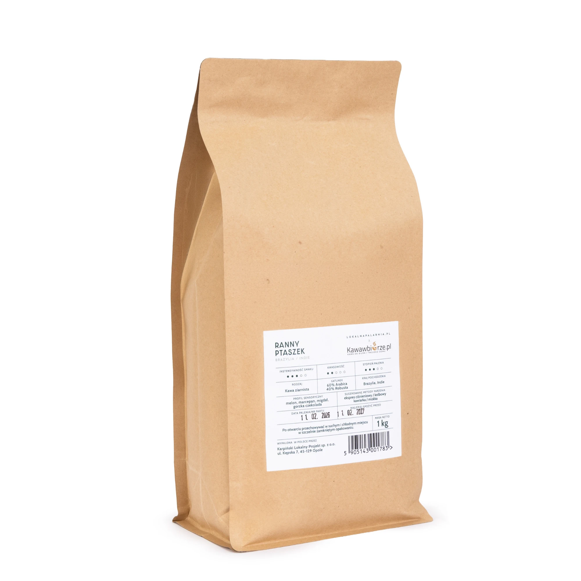 Mieszanka Ranny Ptaszek powstała z arabiki z Brazylii oraz robusty z Indii. Brazylia odpowiada za czekoladową bazę i delikatną słodycz, natomiast indyjska robusta wnosi wyraźniejszy charakter, wyższą zawartość kofeiny i lekką, przyjemną gorycz.