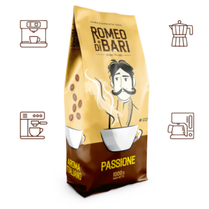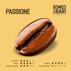 Kawa Romeo Di Bari Passione – świeżo palona kawa z polskiej palarni! Dzięki zastosowaniu w mieszance kolumbijskiej arabiki, wyczuwalne są zdecydowane nuty słodkiej mlecznej czekolady, kakao i brązowego cukru, wzmocnione przyjemnymi esencjami kandyzowanych owoców. Mieszanka charakteryzuje się bardzo niską kwasowością. Mieszanka ziaren Arabica i Robusta w proporcjach 70/30 sprawia, że Passione świetnie sprawdzi się zarówno w kawach czarnych, jak i w mlecznych. Ziarna najwyższej jakości, starannie wypalane w polskiej rzemieślniczej palarni. Kawa produkowana jest tradycyjnymi metodami z troską o unikalny aromat i powtarzalność smaku.