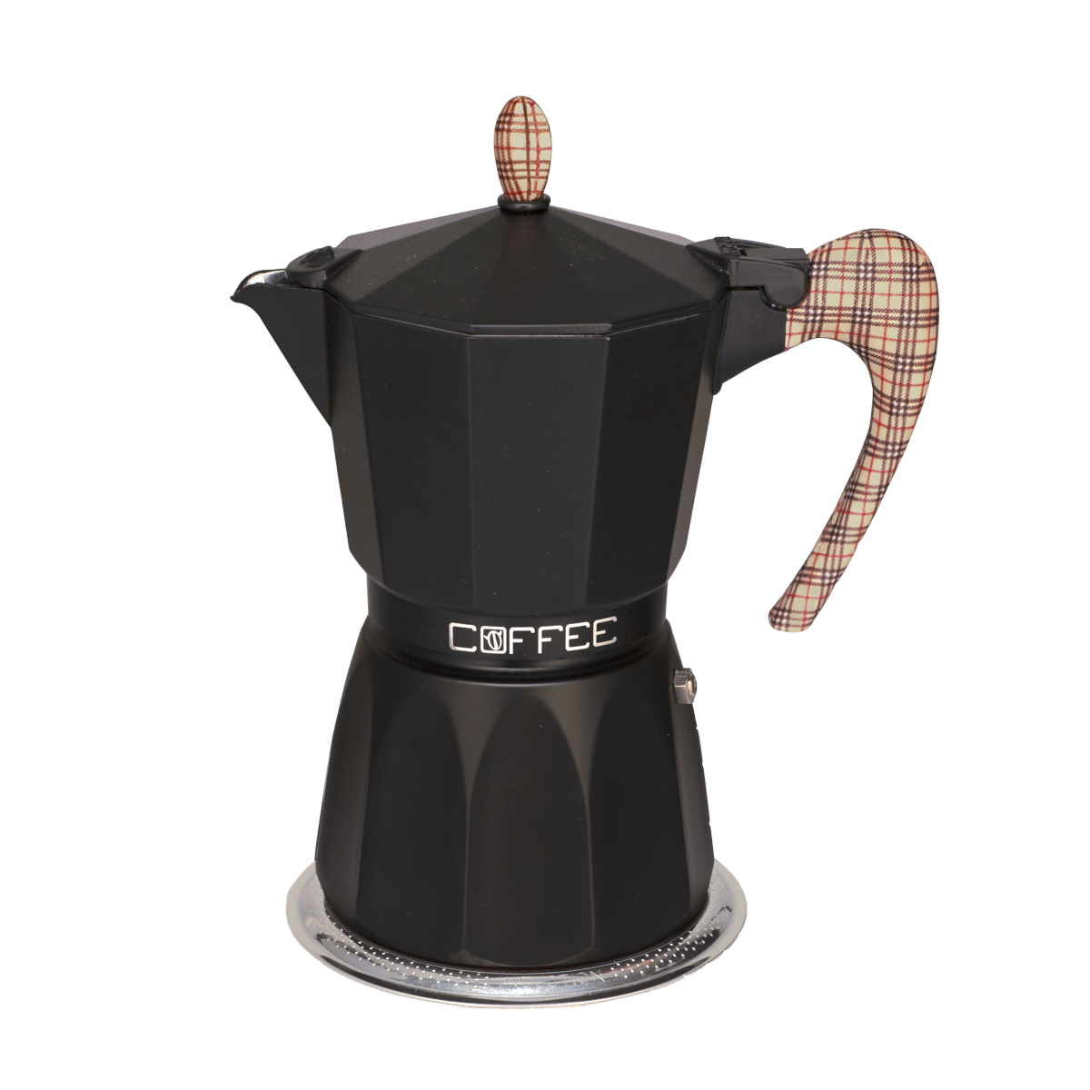 Model kawiarki: Fashion Tessuto Pojemność: 3 tz (3 filiżanki espresso) Kompatybilne z kuchenkami: gazowymi, elektrycznymi, indukcyjnymi Materiał: Aluminium Kolor: Czarny Wymiary pudełka: 30cm x 18cm x 10cm