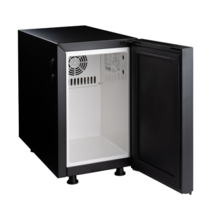 Minimalistyczna, stylowa bryła i wyróżniający się front z czarnego, połyskującego szkła – to połączenie wspaniale będzie się komponować z każdym ekspresem, jednocześnie nie przyćmiewając go. Zaprojektowana tak, aby pasowała do każdego wnętrza. Funkcjonalność na najwyższym poziomie gwarantuje konstrukcja oparta na agregacie chłodniczym z możliwością regulacji. Pokrętło do regulacji znajduje się za tylną obudową chłodziarki. Demontaż tylnego panelu należy wykonywać jedynie po zapoznaniu się z instrukcją.
