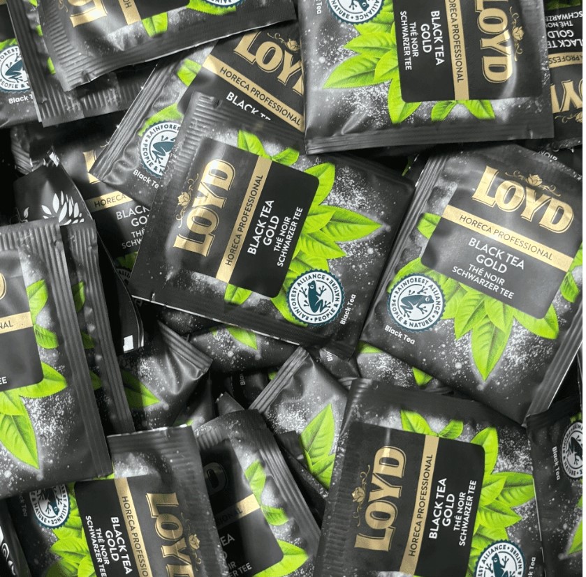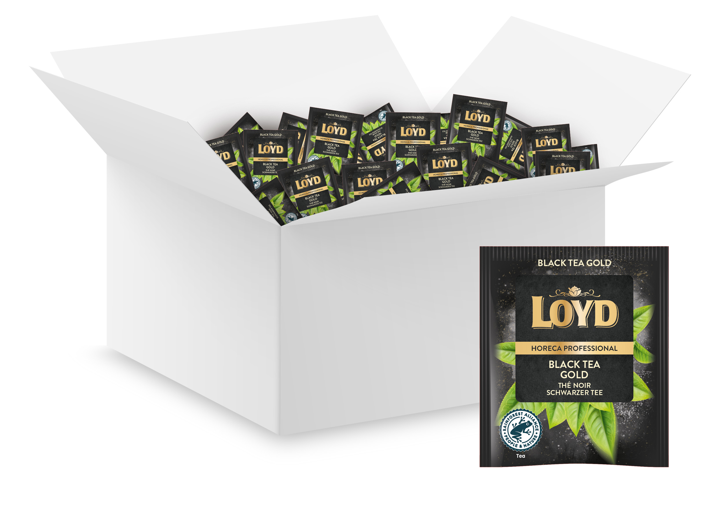 Loyd GOLD TEA – Herbata czarna ekspresowa. Tradycyjna herbata czarna dająca napar o bursztynowej barwie i przyjemnym aromacie. Linia LOYD HoReCa to oferta herbat wysokiej jakości przeznaczone dla gastronomii. Specjalnie wyselekcjonowane herbaty oraz smaki gwarantują zadowolenie Klienta. Każda torebka tej wyjątkowej herbaty zapakowana jest w osobną kopertę z metalizowanej folii o wysokiej barierowości, co bezpośrednio przekłada się na utrzymanie świeżości produktu.