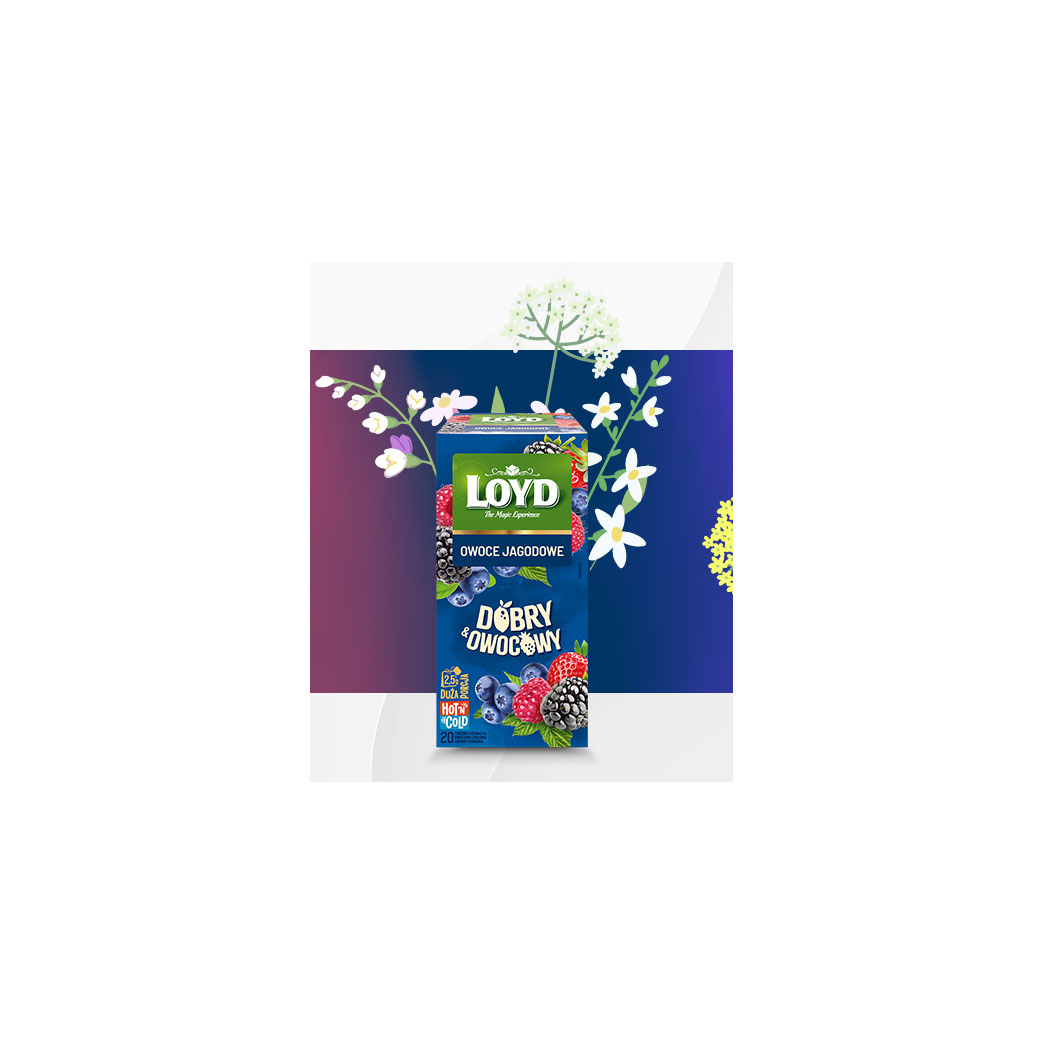 Pyszna mieszanka owoców jagodowych – malina, jeżyna i borówka w intensywnym, aromatycznym naparze. 2,5 g suszu w każdej torebce dla pełni naturalnego smaku.