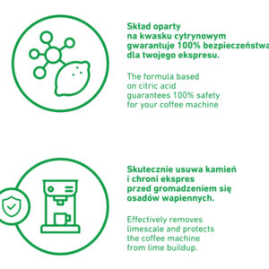 Skład odkamieniacza COFFIX oparty jest na całkowicie bezpiecznym dla środowiska kwasku cytrynowym. Jest to organiczny związek chemiczny, który w niskich stężeniach występuje w naszym środowisku naturalnie, między innymi w wielu owocach i warzywach. Poza jego szerokim zastosowaniem w przemyśle spożywczym, idealnie nadaje się właśnie do odkamieniania. Kwasek cytrynowy posiada status GRAS – (Generally Recognized As Safe), przyznany przez FDA – (Food and Drug Administration), największą amerykańską agencję do spraw badania bezpieczeństwa żywności i substancji przyswajanych przez człowieka.