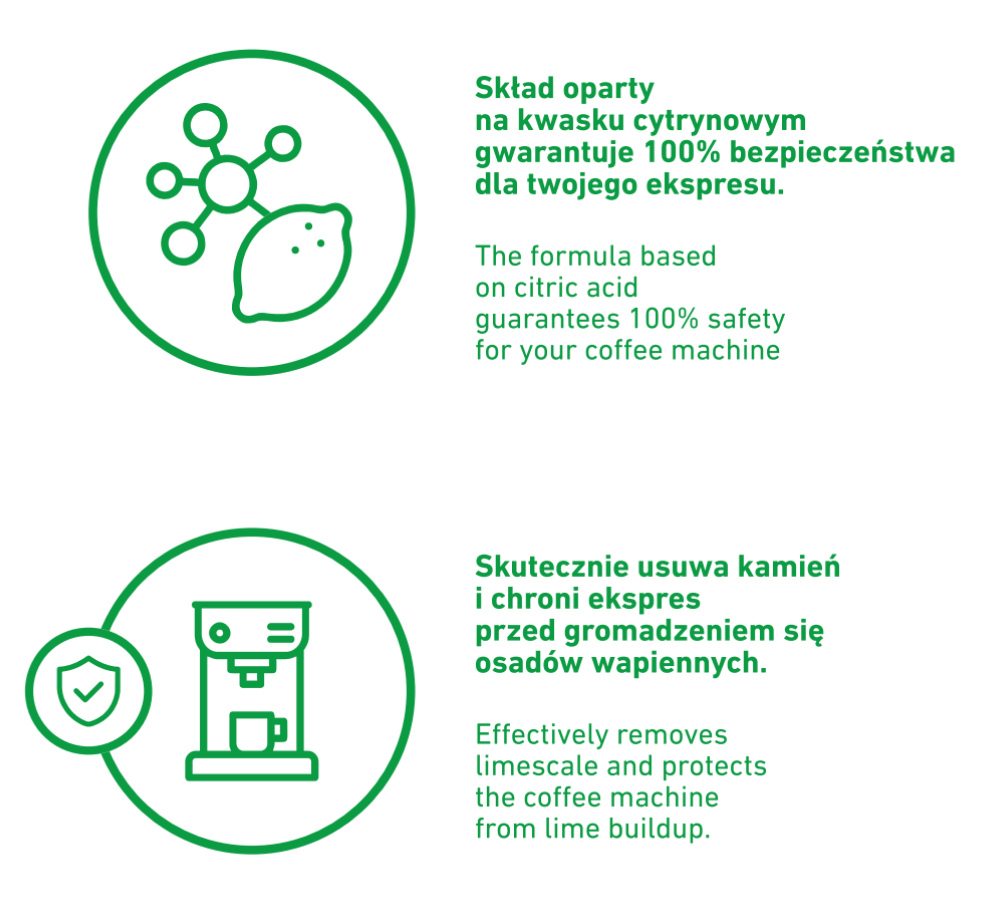 Uniwersalny odkamieniacz COFFIX do wszystkich marek ekspresów do kawy, to sprawdzony i bezpieczny produkt, dzięki któremu skutecznie pozbędziesz się osadów wapiennych z wnętrza swojego ekspresu. Kamień jest przyczyną większości awarii ekspresów do kawy, a twardość wody w większości regionów Polski jest bardzo wysoka. Dlatego regularne odkamienianie twojego ekspresu do kawy jest bardzo ważne. Odkamieniacz COFFIX nie tylko skutecznie usuwa 100% kamienia, ale również chroni ekspres przed gromadzeniem się kolejnych osadów wapnia. Odkamieniacz COFFIX nadaje się również do usuwania kamienia z czajników, żelazek, itp.. Środek nie zawiera substancji zapachowych, jest bezpieczny dla produktów spożywczych i nie zawiera barwników.