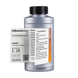 Przygotować 10% roztwór odkamieniacza (np. 100 ml preparatu + 900 ml wody). Ekspresy do kawy należy odwapniać według instrukcji producenta.