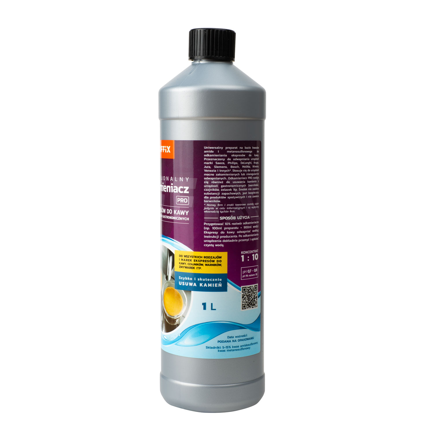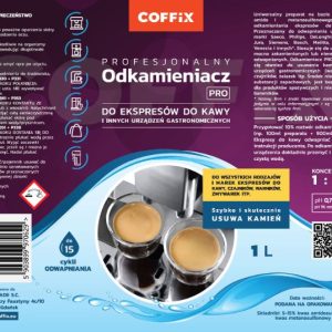 Odkamieniacz COFFIX PRO 1000 ml Uniwersalny preparat na bazie kwasów amido i metanosulfonowego do odkamieniania ekspresów do kawy. Przeznaczony do odwapniania urządzeń między innymi marek: Saeco, Philips, DeLonghi, Krups, Jura, Siemens, Bosch, Melitta, Nivona, Venezia i innych*. Stosuje się do urządzeń mocno zakamienionych lub nieregularnie odwapnianych – środek do użycia profesjonalnego – mocniejszy od tradycyjnych odkamieniaczy dostępnych na rynku. Odkamieniacz PRO nadaje się również do usuwania kamienia z urządzeń gastronomicznych (warników), czajników, żelazek, itp.. Środek nie zawiera substancji zapachowych, jest bezpieczny dla produktów spożywczych i nie zawiera barwników.