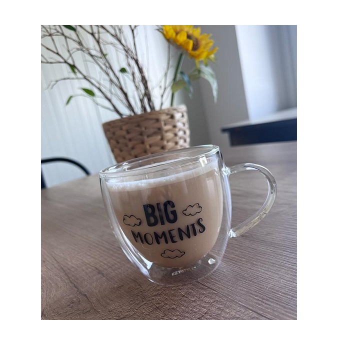 Zestaw okrągłych szklanek termicznych z uchem do kawy i herbaty z napisem „Big Moments” został wykonany z wysokiej jakości szkła. Piękny kształt i odpowiedni rozmiar pozwolą w sposób wyjątkowy zaprezentować idealne trójwarstwowe latte macchiato. Niezrównana przyjemność picia kawy i herbaty gwarantowana!