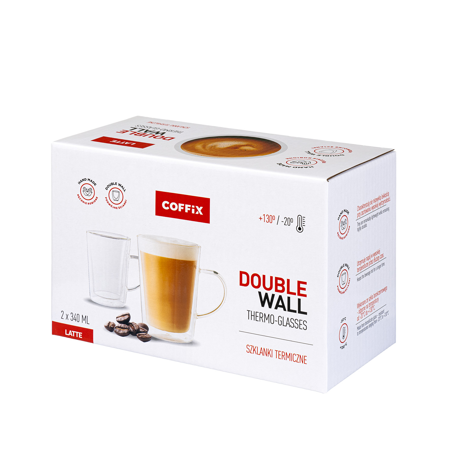 Zestaw dwóch szklanek COFFIX o pojemności 340 ml każda, stworzonych specjalnie do serwowania Latte. Ręcznie wykonane, łączą elegancję z funkcjonalnością – podwójne ścianki utrzymują temperaturę napoju, chronią dłonie przed gorącem i pozwalają cieszyć się zarówno gorącymi, jak i zimnymi napojami. Odporne na temperatury od -20°C do +130°bbbbC, idealne do codziennego użytku i wyjątkowych chwil przy kawie.