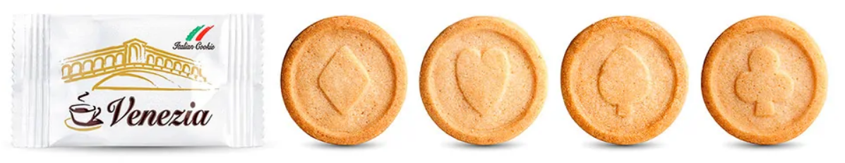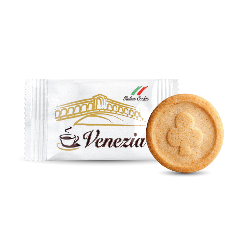 Oryginalne włoskie ciasteczka do kawy o przyjemnym waniliowym smaku. Świetnie komponują się z mlecznymi kawami jak Latte Macchiato, Cappuccinno, czy Flat White; oraz czarnymi jak Caffe Crema, Americano, Lungo, czy Espresso. Produkowane w północnych Włoszech między Mediolanem, a Weroną. Pojedyncze pakowanie gwarantuje świeżość każdego ciastka. Świetnie sprawdzają się w biurach, hotelach, restauracjach i kawiarniach. Waga netto sztuka: 3 g Opakowanie zbiorcze: 500 szt. Jednostka sprzedaży: 500 szt. Pakowanie: luzem w kartonik zbiorczy.